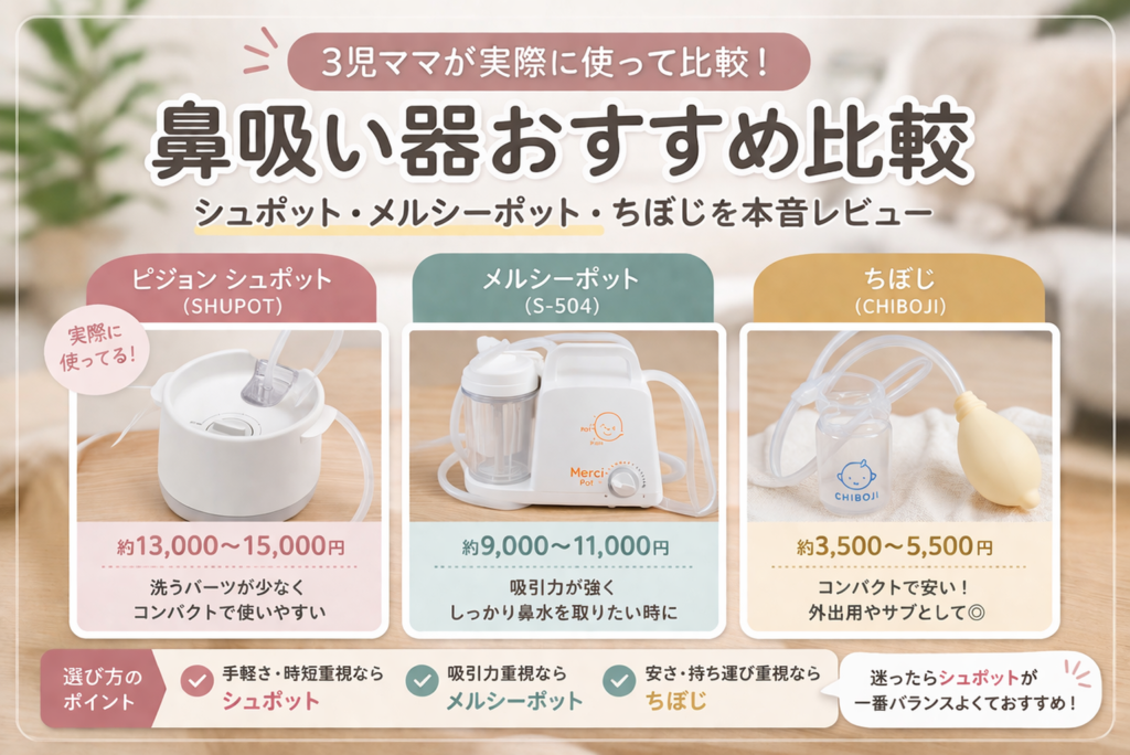鼻吸い器どれがいい?3児ママのリアル比較【シュポット・メルシーポット・ちぼじ】